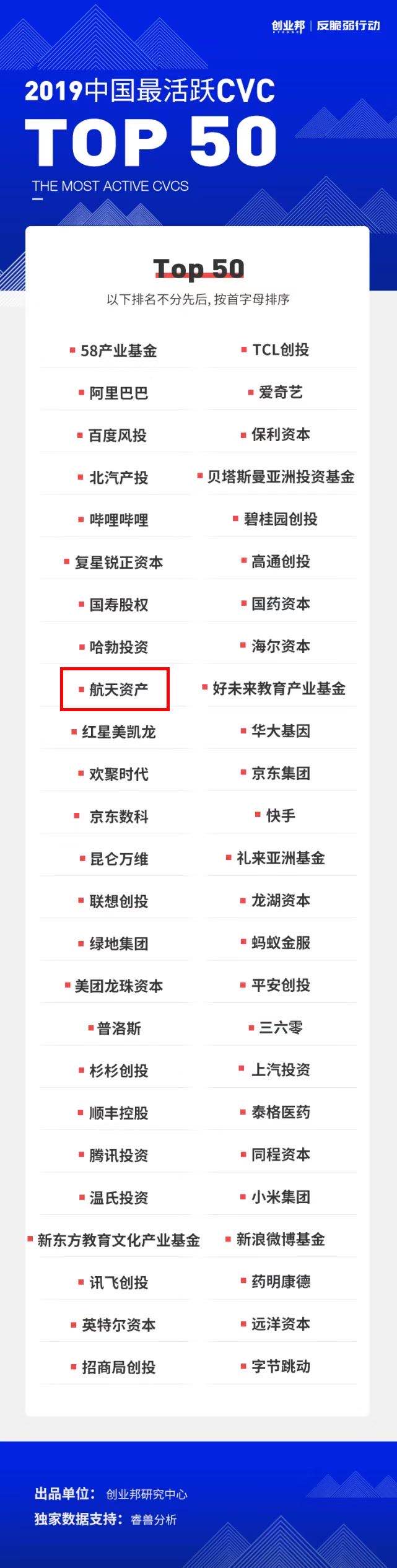 在国内知名创业投资研究和资讯机构创业邦研究中心6月10日发布的2019年度CVC系列榜单中,资产公司及旗下各基金公司构成的联合体—航天资产入选两大重磅榜单:“2019中国最活跃CVCTOP50”及“2019中国最活跃制造业CVCTOP5”。一同入围的还有招商局创投、阿里巴巴、腾讯投资、北汽产投等多家知名CVC机构。