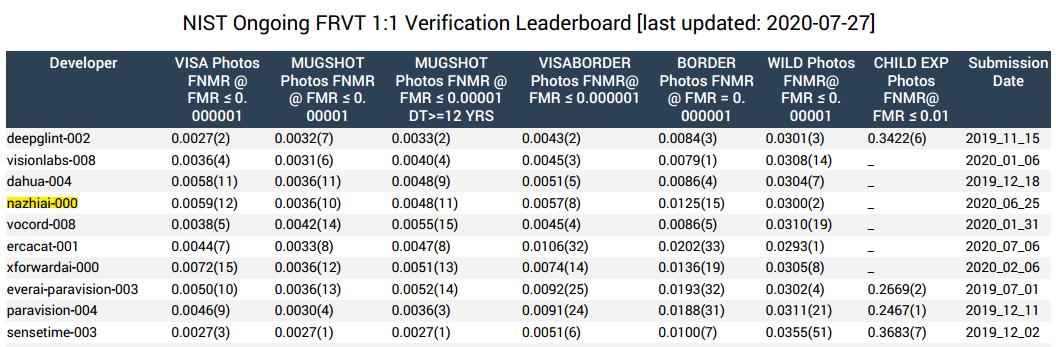7月27日,美国国家标准与技术研究院(NIST)公布了全球最权威的人脸识别算法测试(FRVT)的最新结果,资产公司所投苏州纳智天地智能科技有限公司(以下简称纳智天地)首次参与该竞赛并获得了全球第四名的好成绩。诸多国内外一流的人脸识别技术企业都参加了本次测试,中国企业格灵深瞳排在第一名,商汤科技排在第十名,依图科技排在第十九名。值得一提的是,FRVT的排名采取的是历史累计的计算方法,每次更新结果均基于有史以来所有参与FRVT的机构最优成绩综合排名,最大程度保证测试结果的准确性和权威性。本次竞赛中,中国企业占据了前十名的半壁江山,可见中国企业的人脸识别技术水平已经走在世界前列。纳智天地的成绩印证了其自身是全球人脸识别技术最好的公司之一。本次美国FRVT NIST人脸竞赛官方排名如下所示: