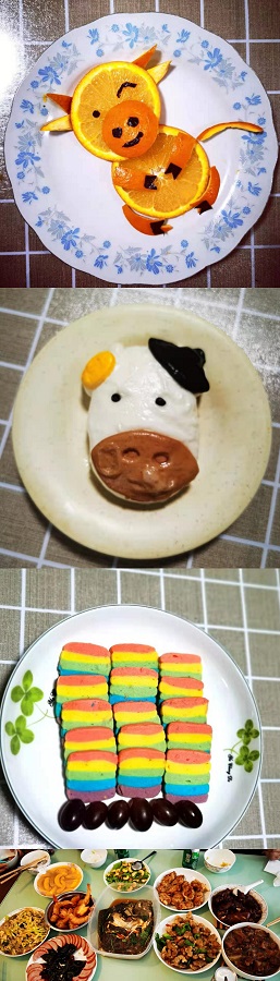 对于老一辈儿来说,春节两个字满满洋溢着团圆和幸福,是一桌心意绵长的美味年夜饭,是一家子围看的热闹春晚,是小辈儿奶声奶气的拜年与厚厚的压岁钱,也是照亮一年岁月的期盼。一桌子年夜饭,要有鸡,寓意吉祥如意;要有鱼,寓意年年有余;要有年糕,寓意孩子们年年高学业有成;要有黄桃(寿桃),寓意老人们有福长寿。除了与妈妈下厨一起学习做各色传统美食(我主要是打下手,差得远呢),我更愿意带着女儿做有趣的小点心和小饼干(掩饰我厨艺不好的事实),用橙子和海苔拼出小牛,做小牛和小鱼的花色面点,做彩虹的曲奇饼干。