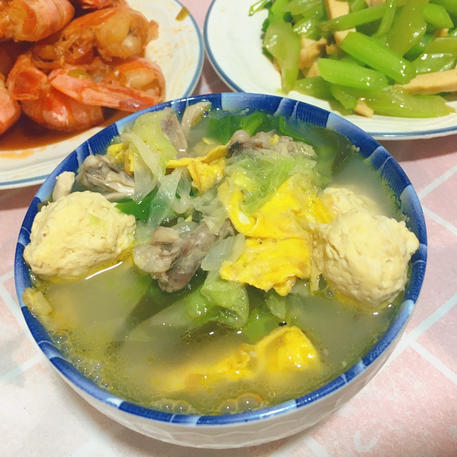 过年在姑姑家,做的蔬菜蛋饼丸子汤,是家常菜的味道。配料有海带丝,薄鸡蛋饼切丝,青菜,肉丸,用点高汤打底,这样就不再需要太多其他调料,清淡又鲜美,食材也比较均衡。