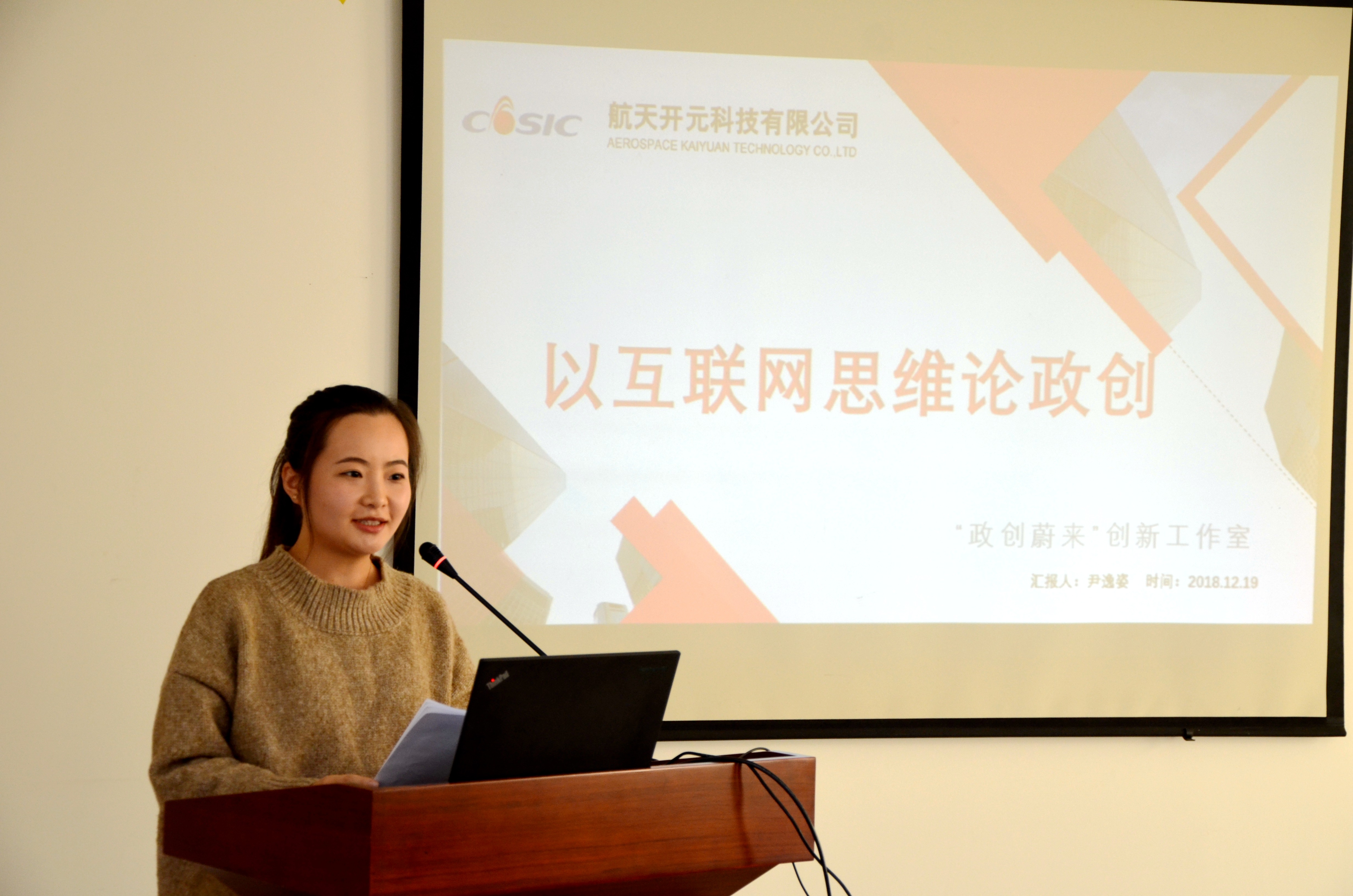 航天开元科技有限公司“政创蔚来”青年创新工作室骨干尹逸姿,围绕青创室的工作思路、创新想法从迭代思维、用户思维、简约思维、极致思维、大数据思维等多个方面讲授《以互联网思维论政创》。