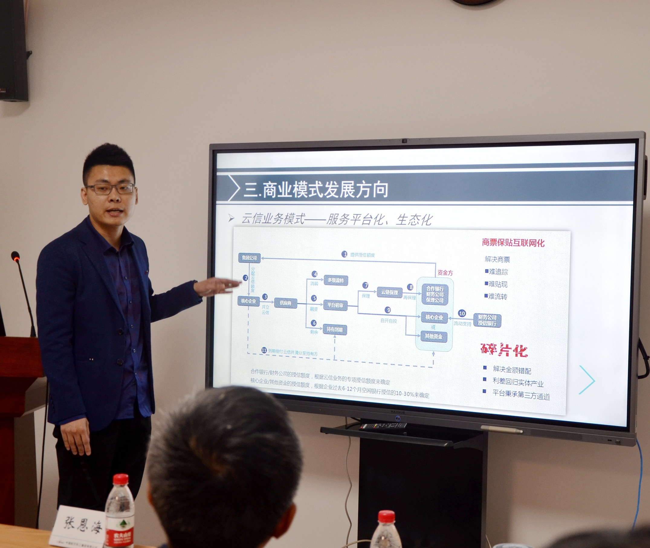 计划财务部财务处袁浩以《供应链金融初探》为题,从概念定义、出现动因、核心特点、融资模式以及国内外的发展演进等方面介绍了供应链金融,同时以中企云链为案例探索了供应链金融商业模式发展方向。