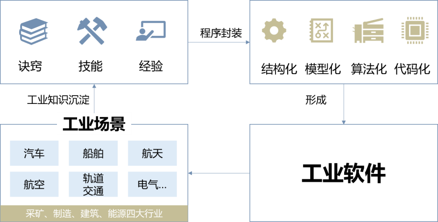 在实际工业场景中,如汽车制造、船舶制造,人们获得了诀窍、技能、经验,通过程序化、算法化、模型化等手段,封装成了工业软件。工业软件能够控制生产设备、优化制造和管理流程,提高生产率,是现代工业的“大脑”和“灵魂”。