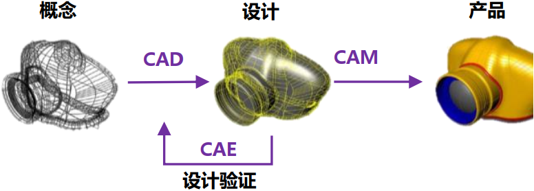 在技术层面上,CAD和CAE是两大技术方向,CAD的核心是基于集合模型的造型建模,CAE是基于物理模型的数值拟合求解,而CAM是将CAD建模转化为数控加工程序的功能。在应用层面上,CAD、CAE、CAM三者环环相扣,由CAE软件读取CAD的初步建模,进行工程分析(仿真模拟),再将结果反馈给CAD继续优化产品设计,最后由CAM进行自动化数控编程。流程结束后与生产管控和管理运营软件结合起来进行生产作业,由生产制造系统进行加工制造。