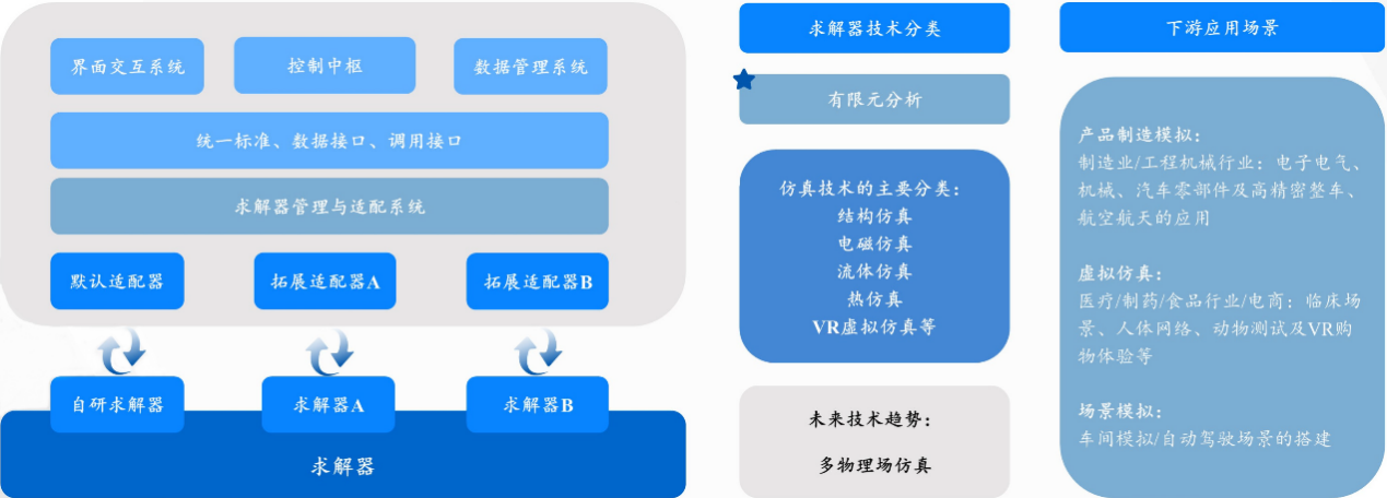 CAE是求解产品最优结构、性能的软件。在研发部门使用CAD软件得到初步几何模型以后,使用CAE软件在物理角度上优化模型性能,包括静态结构分析、动态分析、电磁分析等。实现上述工程分析所依赖的正是CAE软件的核心技术—求解器。求解器是CAE软件的底层“黑盒子”,指的是针对特定场景(比如液体流动、温度传播以及结构变形),用程序编码的方式实现的对物理规律、数学原理的客观还原。求解器可以类比为生活中使用的计算器,当我们在其屏幕上输入若干数字和运算符后,计算器会自动计算并输出结果。所有和计算相关的内部运算操作都集成在计算器的内部,使用者无法直观地获得对运算过程的观察和监控,就像个“黑盒子”一样。