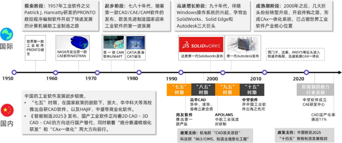 设计类软件是工业软件的起始点。设计软件开始于20世纪60年代,第一款CAD软件诞生于1957年,军工、航空航天领域内部开发内部使用。