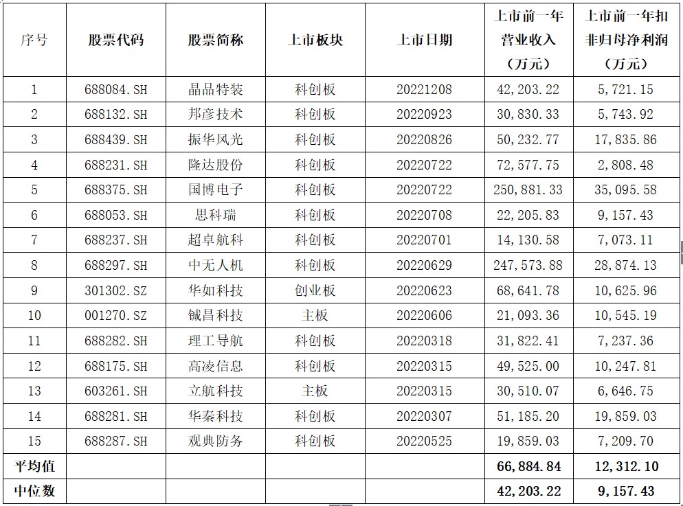 15家公司上市前一年(2021年)平均营业收入为66,884.84万元,平均扣非归母净利润为12,312.10万元;营业收入中位数为42,203.22万元,扣非归母净利润中位数为9,157.43万元。无论是营业收入和扣非归母净利润的平均数还是中位数,都较2020、2021年有较大幅度的提高,基本达到了2019年的水平。