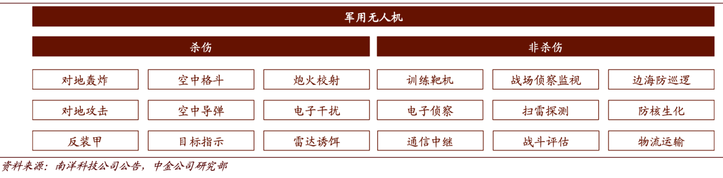 根据用途划分,无人机可以分为军用与民用两类。其中军用无人机按功能划分,可分为杀伤性无人机及非杀伤性无人机,代表类型有无人侦察机/监视机、无人战斗机、通信中继无人机、电子干扰无人机和靶机,两者主要是不同载荷塑造杀伤性差异。