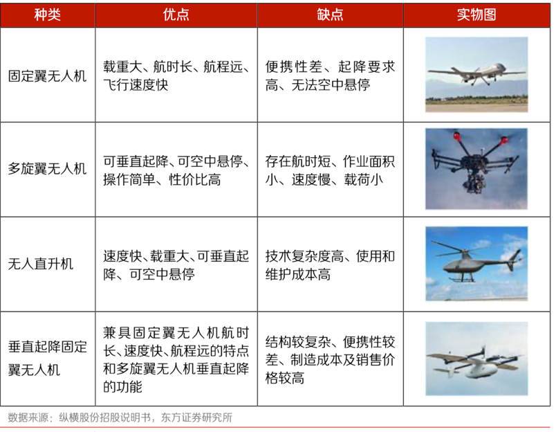 根据气动布局分类,无人机主要分为固定翼无人机、多旋翼无人机、无人直升机、垂直起降固定翼无人机。其中,垂直起降固定翼无人机兼具固定翼和多旋翼的特点,对起降场地要求低、可空中悬停,适用于大面积、长航时作业,可携带载荷作远距离探测,具有应用优势。