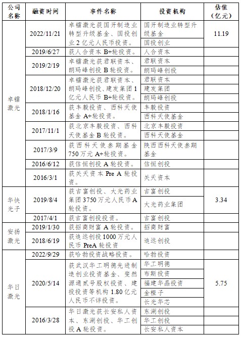 国内超快激光企业融资活跃。2022年11月,北京卓镭激光获国开制造业转型升级基金、国投创业2.00亿元人民币C轮投资,合计出资比例17.8742%,估值11.19亿元;2022年9月武汉华日激光获哈勃投资战略投资。另据行业调研了解,武汉安扬激光最新一轮融资估值20亿元;杭州奥创光子主营飞秒激光器,虽然飞秒市场尚未起量,公司最新一轮估值已达10亿元。