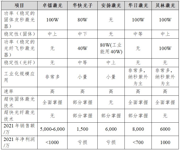 华日激光:2021年收入8000万元,净利润约700万。华日激光是激光设备上市公司华工科技旗下公司,在2014年收购了加拿Attodyne公司,开始涉足超快激光领域。团队多为海归博士,人力成本高,超快激光产品是走固体激光器技术路线,无光纤激光技术,产品功率、稳定性一般,主要供给股东华工激光。